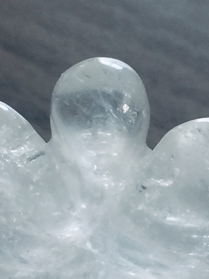 Vue arrière d’une tête d’ange en cristal de roche, photo du 13 Septembre 2019
